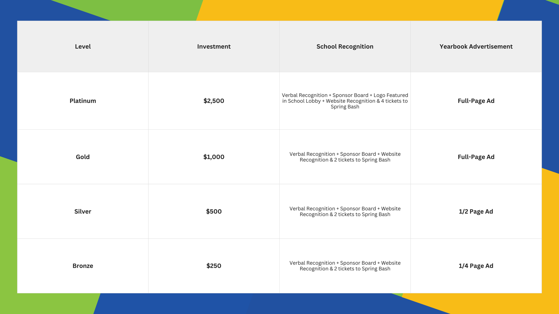 We offer four tiers of partnership. Every sponsor will be